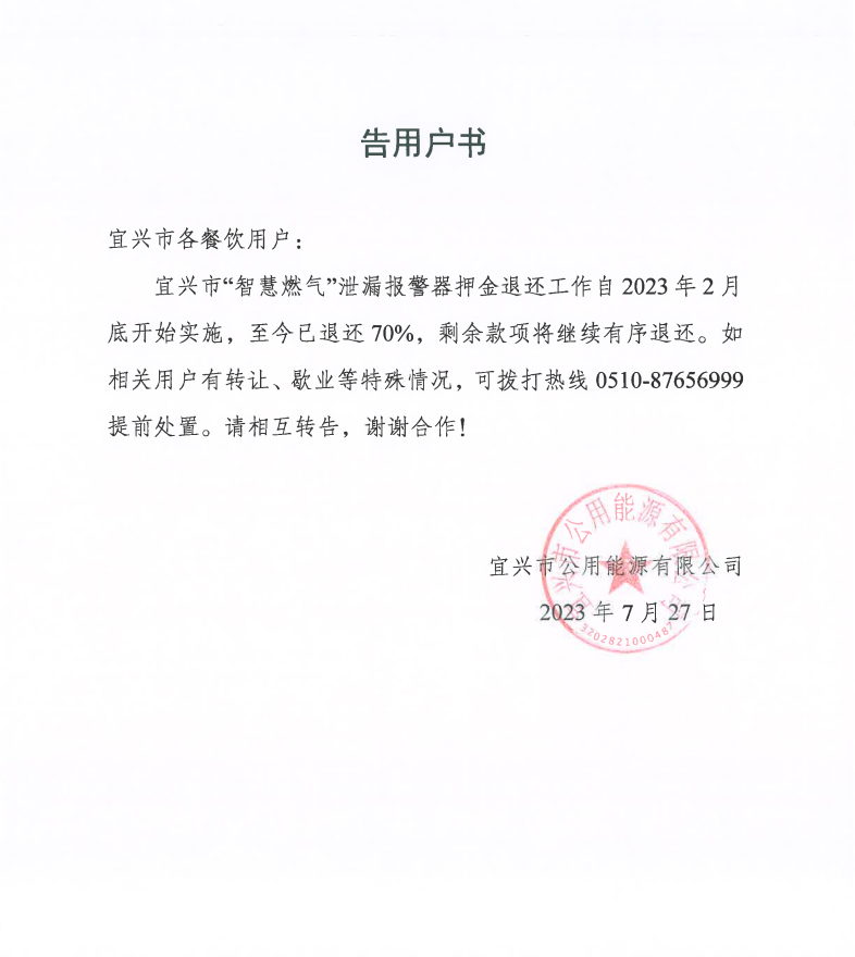 宜興市“智慧燃?xì)狻毙孤﹫缶餮航鹜诉€工作自2023 年2月底開始實施,至今已退還 70%,剩余款項將繼續(xù)有序退還。如相關(guān)用戶有轉(zhuǎn)讓、歇業(yè)等特殊情況,可撥打熱線 0510-87656999提前處置。請相互轉(zhuǎn)告,謝謝合作!